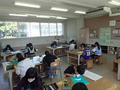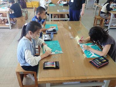 4年2組は図工。慎重に彫刻刀を使い、版画を彫っています。