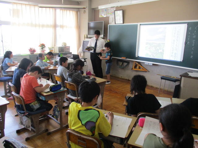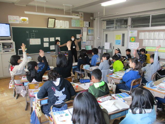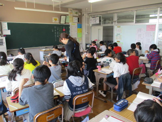 本校では、確かな読み取りをもとに、豊かな学びを追究する児童の育成を目指し、国語科を研修教科としています。本日も、①自分の考えを根拠を明確にして発言、②グループで意見交換、③要旨をまとめる 等の学習に集中している子どもたちの姿が見られました。