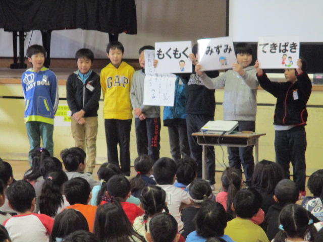3月の朝会で高学年児童が、今月の生活目標を分かりやすく説明し、全校に呼びかけてくれました。