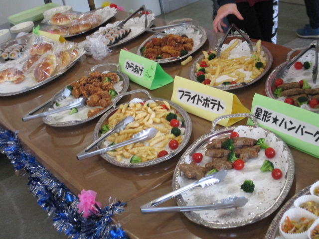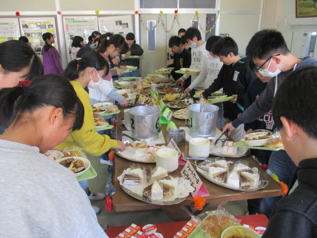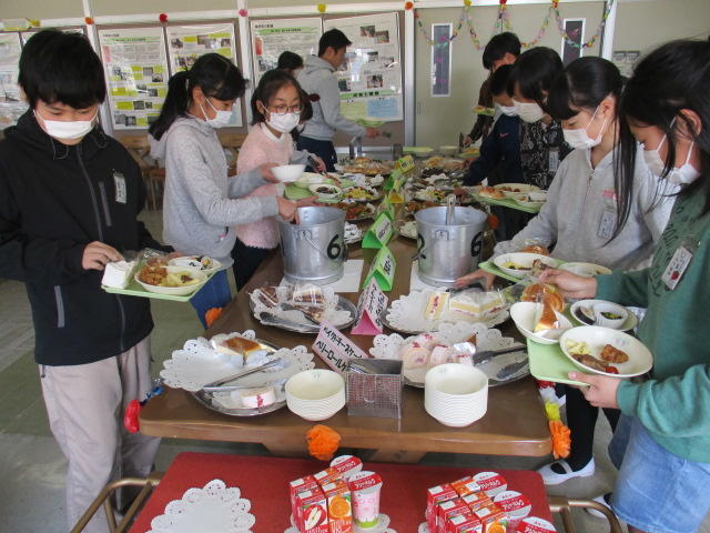 6年2組のバイキング給食の風景です。種類が豊富で豪華なメニュ-をみんなで仲よく、そしておいしくいただきました。