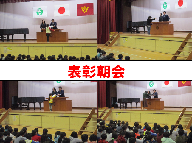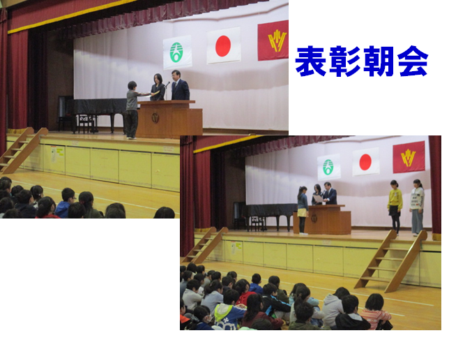 本日、手紙作文コンクール、未来を担う私たちの主張作文、家庭の日ポスター、埼玉県美術展、人権ポスター、県読書感想文の表彰朝会が行われ、8名の子供たちが表彰されました。