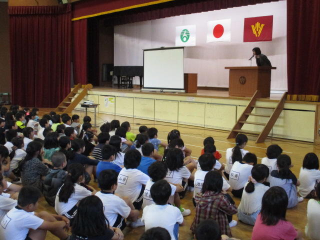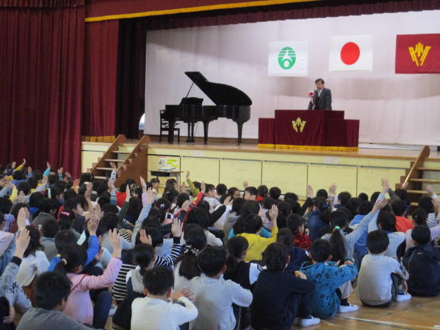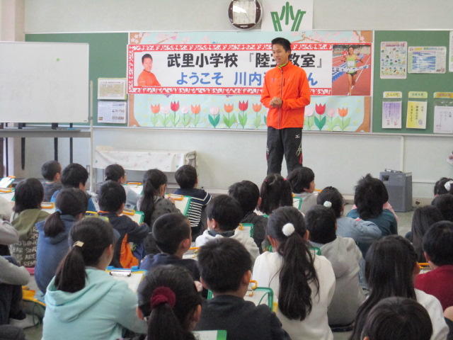 プロのマラソンランナー川内鴻輝様をお招きし、4年生の陸王教室(体育授業)が行われました。あいにくの天候で室内で実施されましたが、速く走る、長く走るポイントの説明や実技披露、夢に向かって取り組むことの大切さなど御指導いただきました。