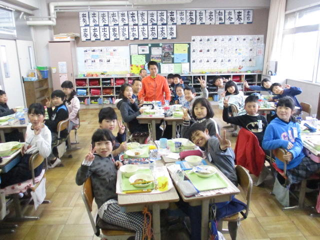 6年2組と1年1組の交流給食がありました。1年生は、お兄さんお姉さんとおいしく給食をいただきました。6年生は、配膳の仕方や給食のマナーを、弟、妹たちにお手本を示していました。