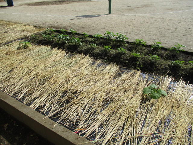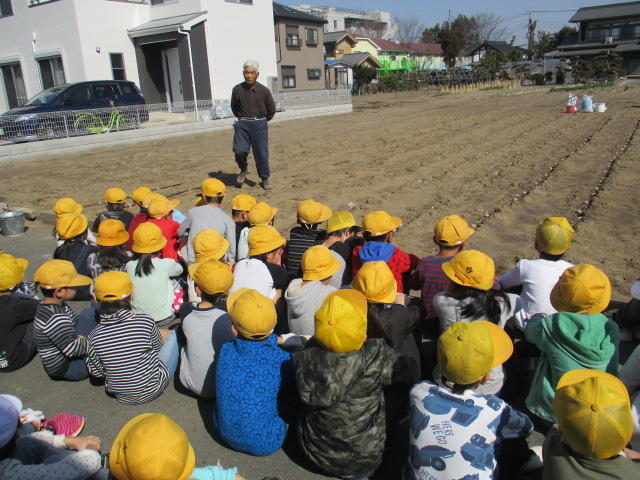 1,2年生、6組の児童が、学校応援団の石川様が所有している畑に、ジャガイモを植えてきました。90日後が収穫の目安とのことです。