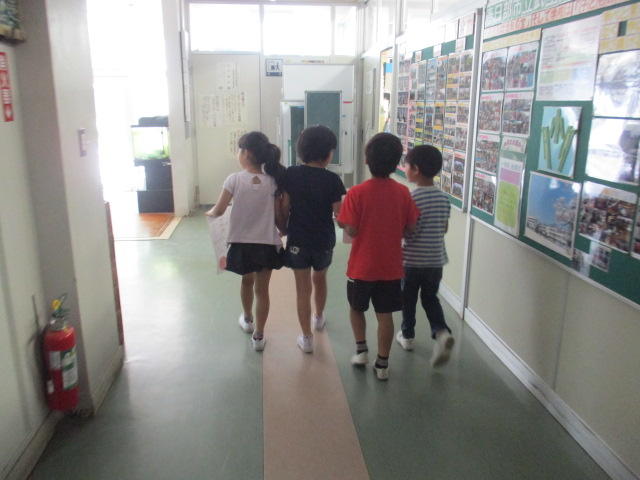 学校探検では、2年生のお兄さんお姉さんが、1年生を優しく誘導して校舎内を探検しました。