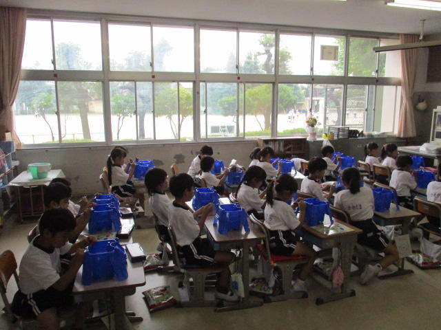 先週、晴天の中、青空お弁当給食が行われました。お弁当のようなメニューの給食を、各クラスごとに校庭や体育館等でいただくという行事です。とても暑い日でしたが、子どもたちは、おにぎり、からあげ、ジュースなどをおいしくいただけたようです。
