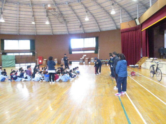 本日雨天のため、交通安全教室を体育館で行いました。1年生は横断歩道等の正しい歩行について、3年生は安全な自転車の乗り方について、警察署や交通指導員の皆様に御指導をいただきました。