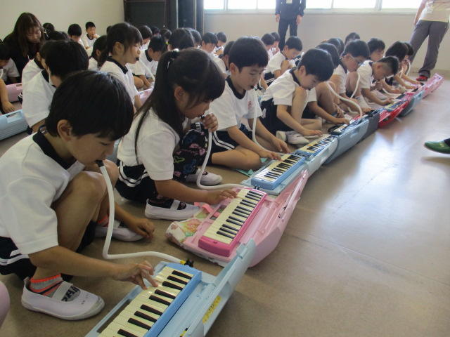 本日、講師をお招きして、2校時に1年生対象に鍵盤ハーモニカ講習会が行われました。引き続き3校時には、3年生対象にリコーダー講習会が行われました。子どもたちは目を輝かせて、音出しや簡単な演奏にチャレンジしていました。
