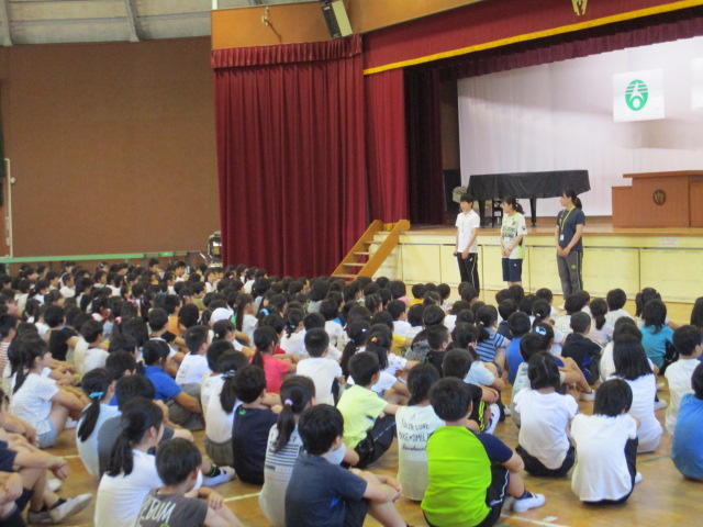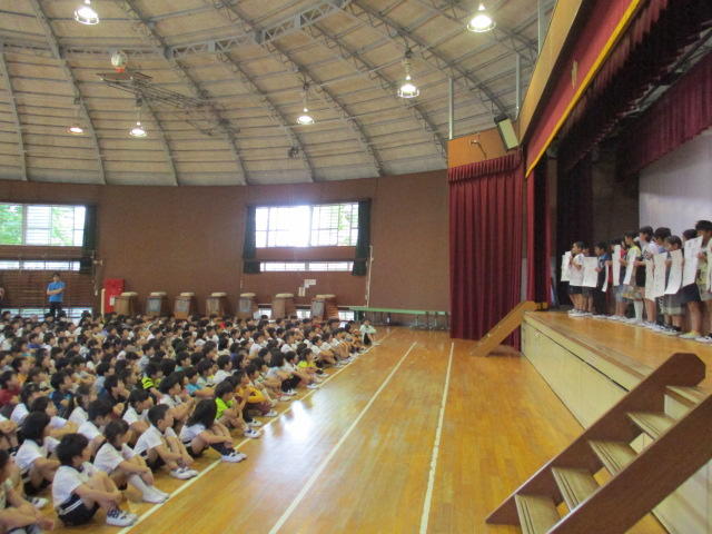 音楽朝会でバトンクラブが発表を行いました。はじめに学年別に発表を行い、最後に全員で創意工夫ある構成の演技を行い、大きな拍手を受けました。御出席の保護者の皆様、ありがとうございました。