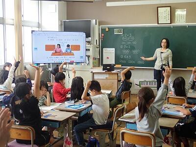 2年1組算数。おはじきを使ってかけざんの学習。「できましたか?」「はーい!」と手がたくさんあがっています。