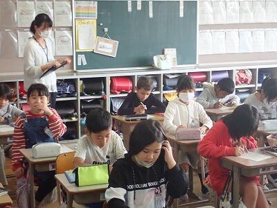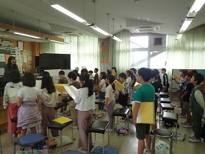 3年1組音楽。先生のピアノ伴奏に合わせて元気に歌っています。