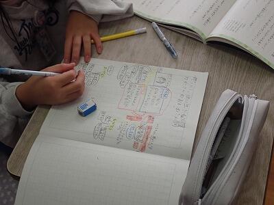 5年2組は、取り組んでいる家庭学習について友達同士で見合っています。自分のノートと比べて気付いた