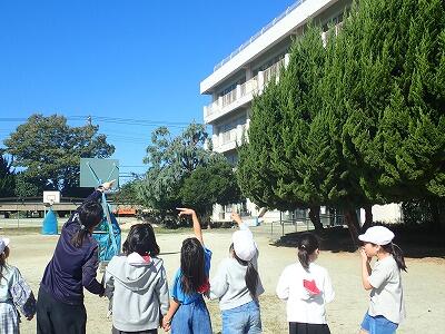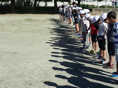 音読が終わり子供たちは校庭へ。みんなでかげおくりを体験しました。