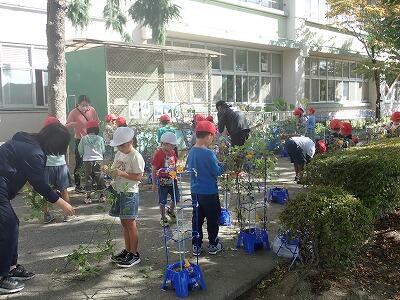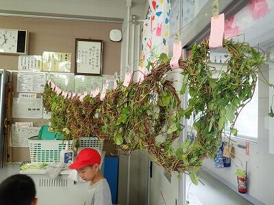 1年生は、「生活科」の学習といしてあさがおのつるを集めリースをつくります。3組の子供たちがつるを集まていま