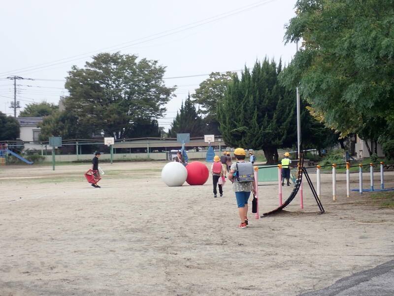 大玉の登場に、子供たちも興味深々。さあ、全校が揃って練習開始と思いきや・・・・雨が。
