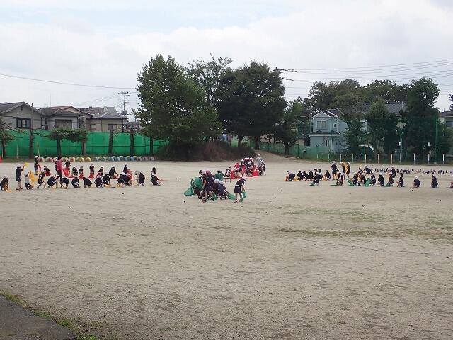 3・2・1年生の子供たちは、大玉を下を転がしゴールに送ります。今日は1勝1敗。決着は本番です。