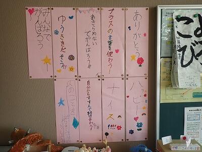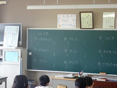 3年生は国語。ローマ字を学習です。後ろの掲示を見ると、使いたい言葉が掲示してありました。