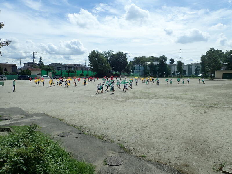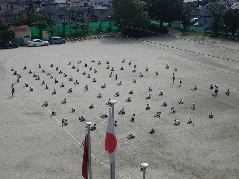 2年生は校庭で運動会の全体練習。運動領域の「リズム遊び」をもとに、ライオンキングをテーマに動きをつくります。