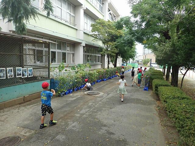 1年生は登校後、欠かさずに朝顔の水やりをしています。