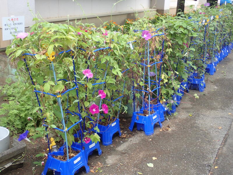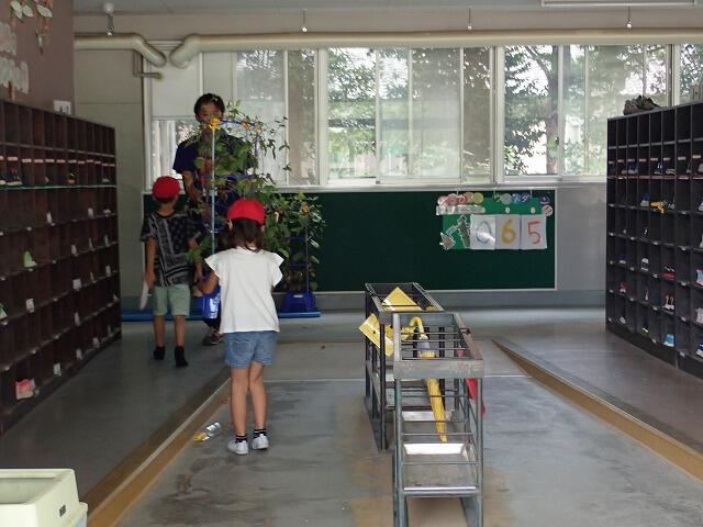1年生は、明日の台風接近に備え、大事に育てている朝顔の鉢を室内に運びます。