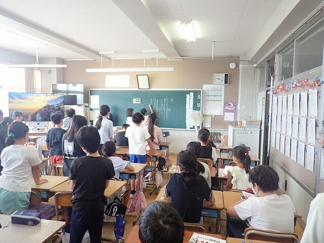5年1組は理科の学習。教科書を見ながらノートをとっています。2組は運動会の