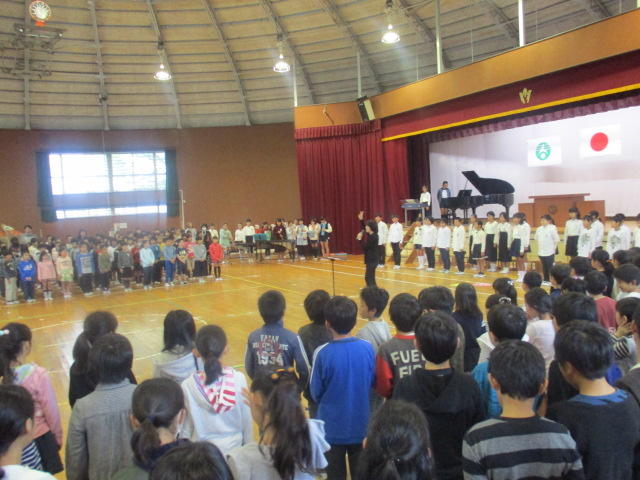 10月の音楽朝会では、前半に、全校で「ふるさと」を歌いました。後半は、市内音楽会に出場する6年2組の児童が合唱を発表しました。御出席くださった保護者の皆様、誠にありがとうございました。