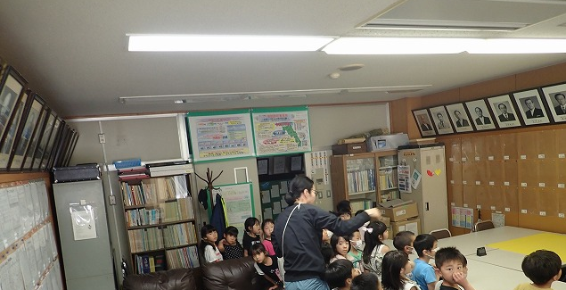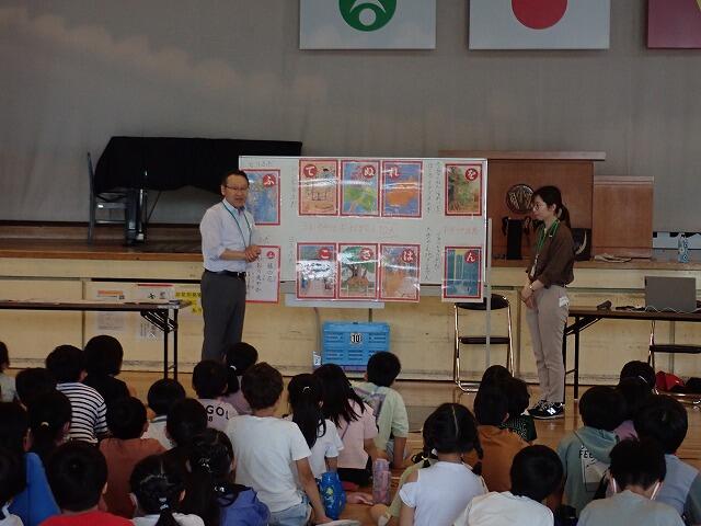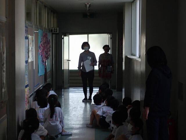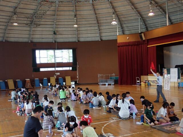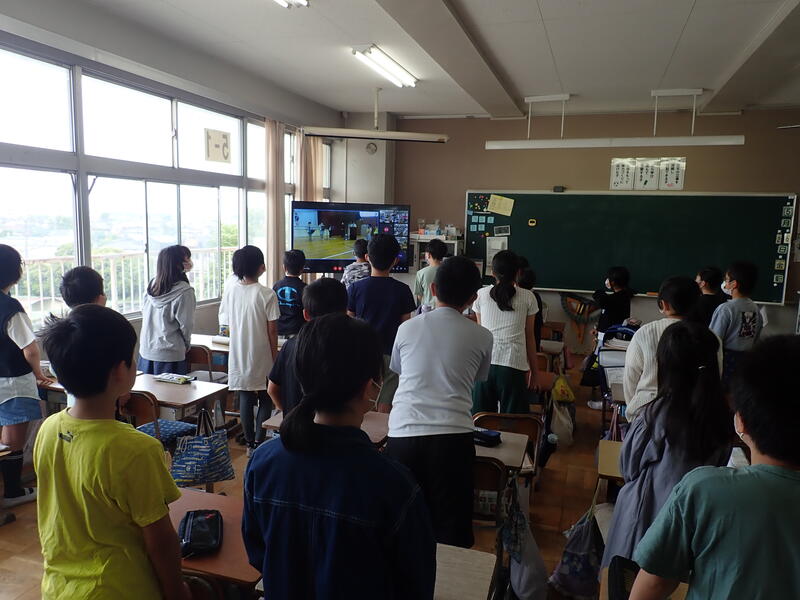 全校児童を体育館対面学年と教室オンライン学年の2つにわけて行いました。