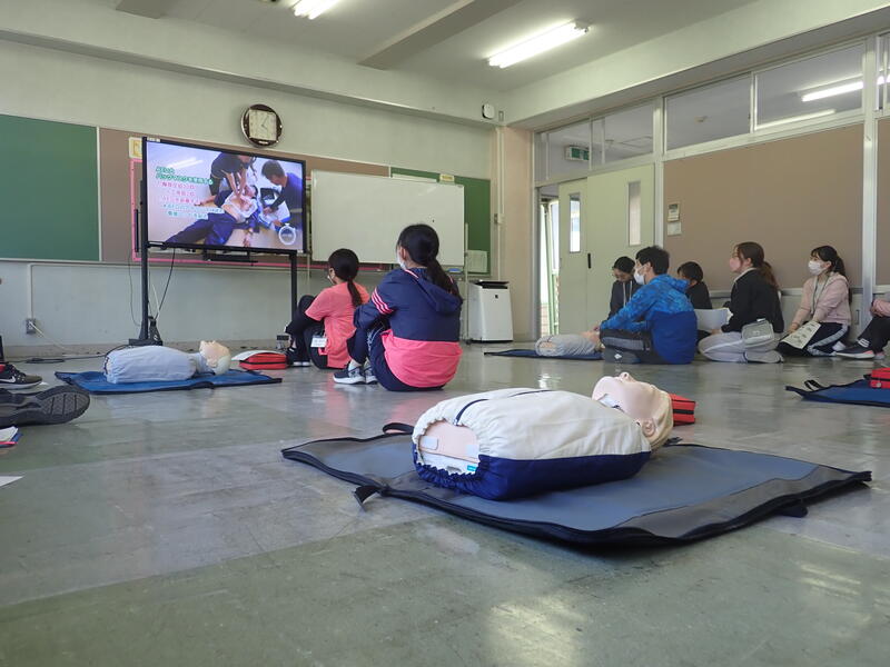 実際に起きたことを想定し、人形を使い心臓マッサージを行いました。