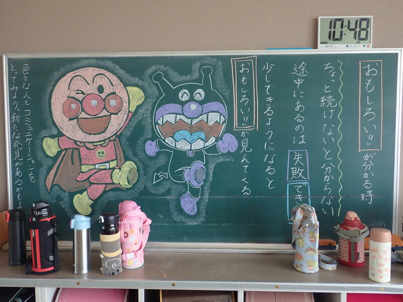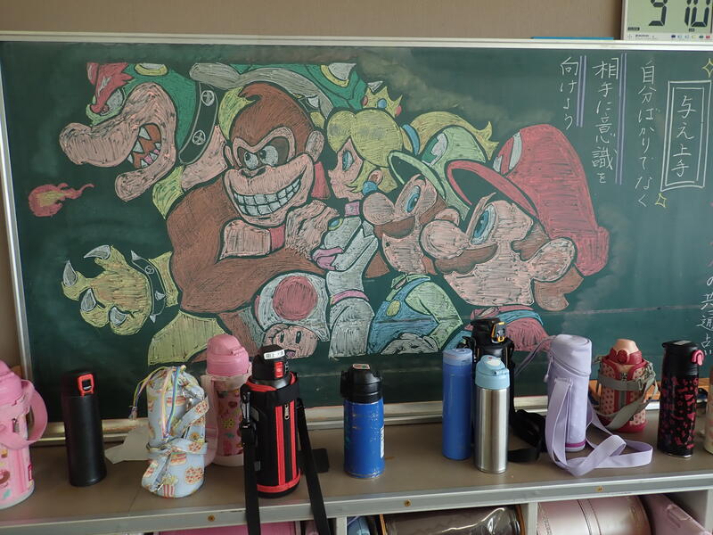 5年1組の後ろの黒板にマリオのイラストとともにメッセージがありました。