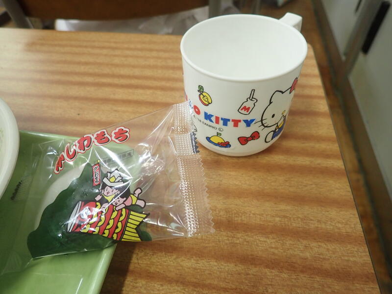 今日の給食を見ると、かしわもちが並んでいます。