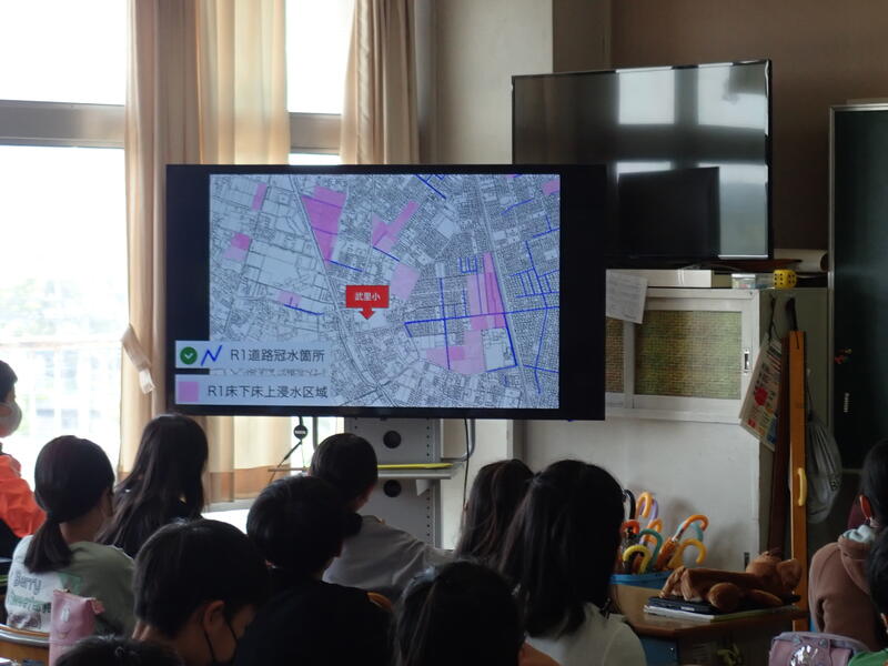 5年生社会。武里小のまわりの土地の様子についてモニター見ながら学習しています。