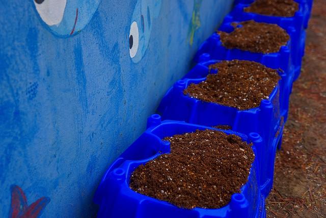 あさがおの種を植えるため、鉢植えに土を入れました。