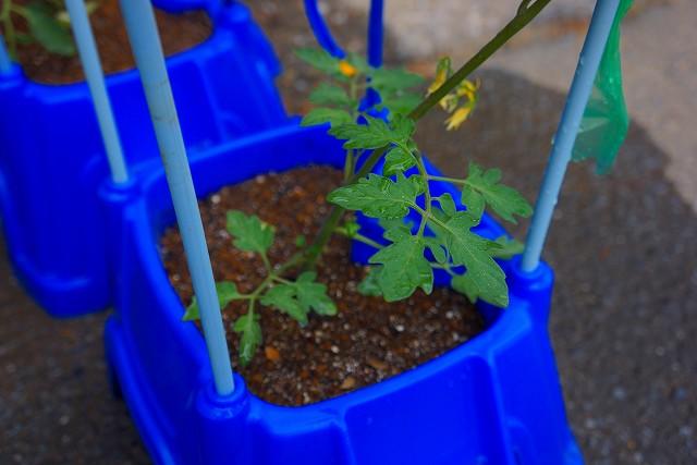 ミニトマトの成長のために、鉢植えに支柱を立てました。