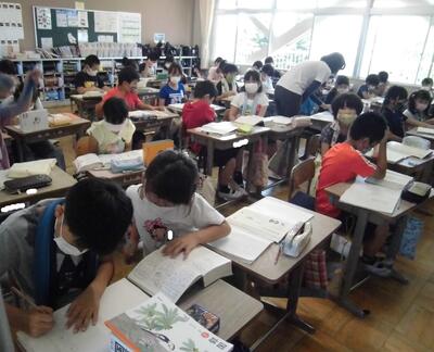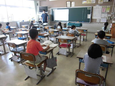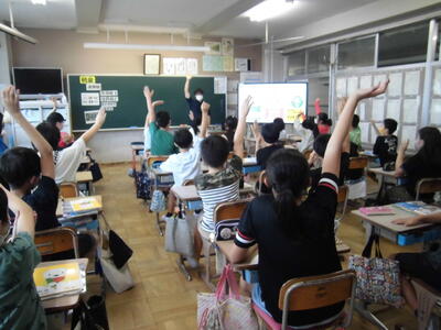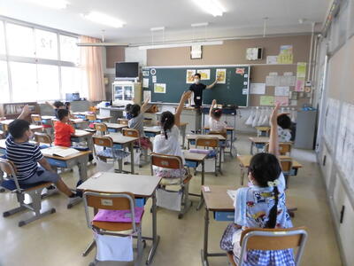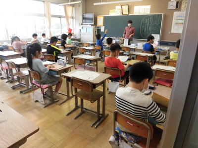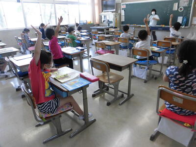 どの学年も、通常のスタイルでの学習が始まっています。下の写真は、1年生国語の「はなのみち」です。子ども達が、手を挙げて発言をしています。