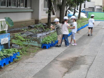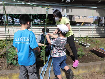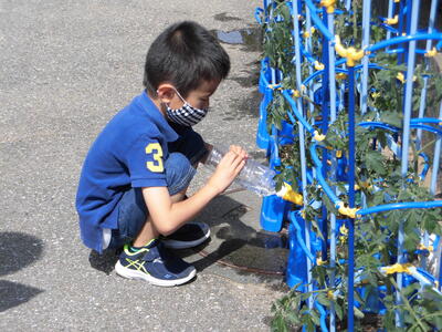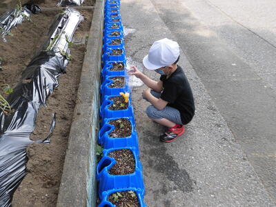 6・7組は、畑のお世話をしました。今年は、きゅうり、ミニトマト、ナスなどの夏野菜とサツマイモにチャレンジ!今から、収穫が楽しみです。