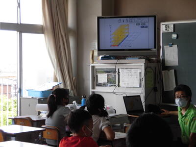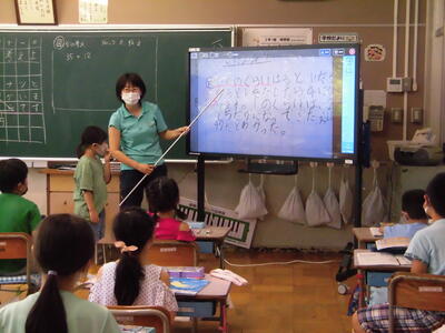 2年生は、算数の学習です。今はまだ隣の人と話し合ったりできないので、児童のノートを大型テレビに映しみんなで話し合っています。