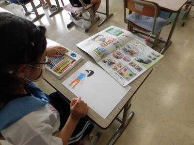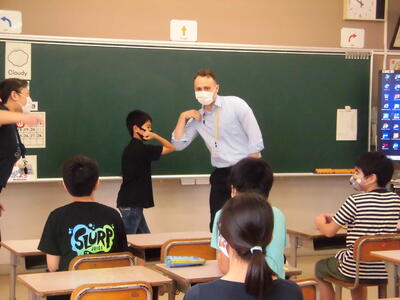 6年生も、久しぶりの英語の授業。3か月ぶりですが、しっかり単語やセンテンスを覚えてコミュニケーションが取れました。ALTと握手ができないので、肘タッチです。