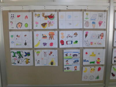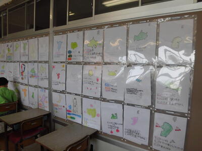 掲示環境も、大分整ってきました。写真は、1年生の廊下です。おうちの方にご協力いただいて、好きなものをたくさん描きました。