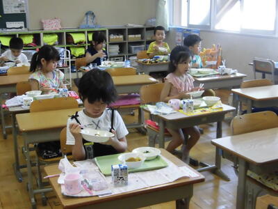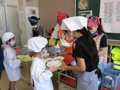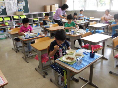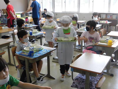 今日の給食は、ビビンバです。1年生も、配膳が上手になりました。好き嫌いなく、野菜もしっかり食べています。
