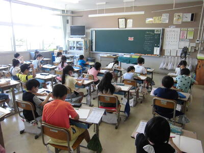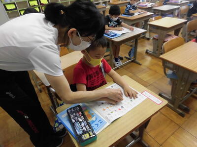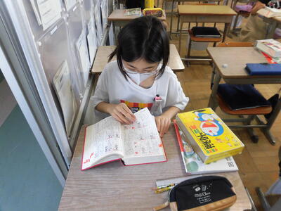 1年生は、初めての発育測定です。発育測定の終わった子は、教室で算数の学習です。