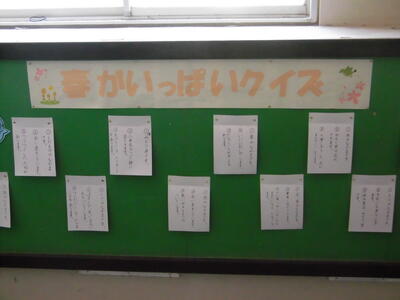 2年生教室に向かう階段は、国語の学習と関連して「春いっぱいクイズ」が出されています。
