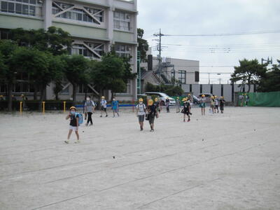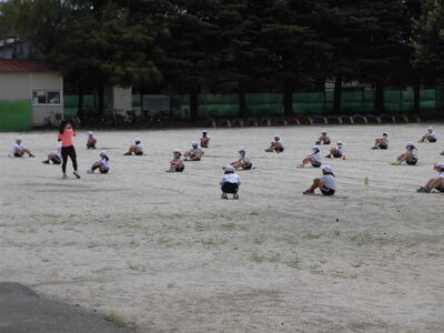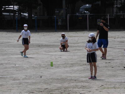5年生の体育の授業です。隣との距離を離しながら、マスクを着用せず活動しています。中にはマスクを着用したいという子もいますのでそれも認めつつ、教員は原則マスクを着用して指示しています。年間指導計画を入れ替え、今日は個人でボール投げの練習です。