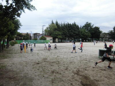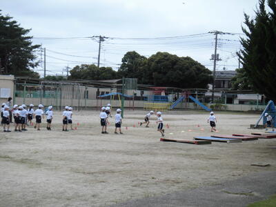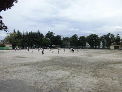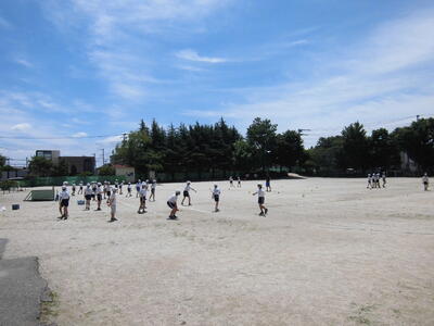 青空のもと、校庭を広く使い体育の授業を行っています。