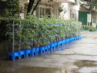 せいかつかで学しゅうする「ミニトマト」は、先生たちが なえをうえておきます。