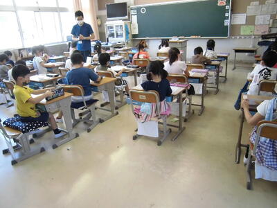 朝は、全校朝会です。残念ながらまだ放送で行いましたが、子ども達は静かにお話を聞くことができました。