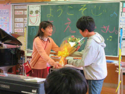 主に前奏と間奏の後の出だしのタイミングを合わせる練習をしましたが、あやかさんからは「武里小の子どもたちはマスターするのが早いですね。」とお褒めの言葉をいただきました。