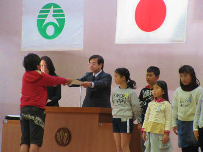 今日は、書き初め、図工、音楽など、たくさんの児童がステージの上で表彰されました。