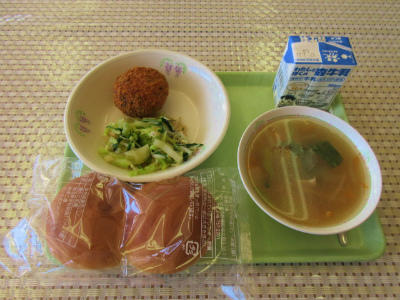 はちみつパン、水菜サラダ、鮭チーズコロッケ、春雨スープ、牛乳です。