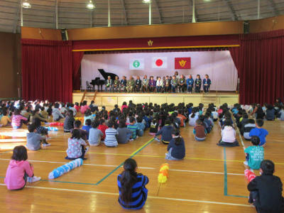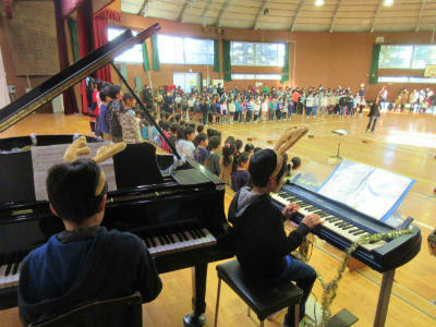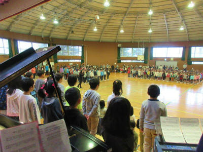 体育館での集会が終了し、わかたけホールに移動した後、6年生が市内音楽会で歌った「ハナミズキ」を合唱しました。
