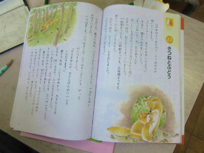 「きつねとぶどう」というお話を読みながら、子ぎつねの気持ちを考えていきます。